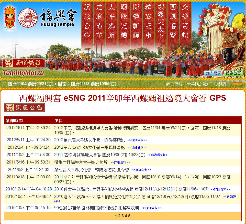 福興宮官網的標題未修正,連結內容為2012年的GPS即時轉播資訊。